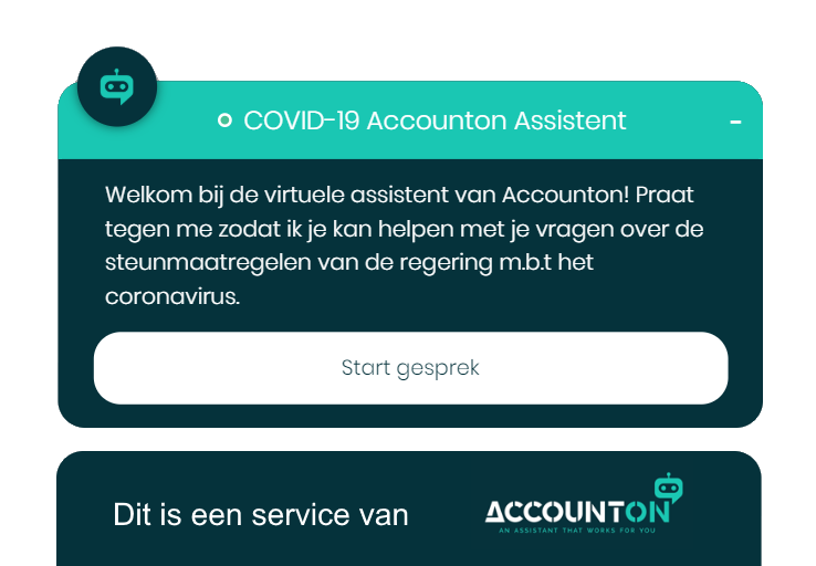 In samenwerking met Accounton.io bieden wij u een virtuele assistent aan. https://accounton.io/nederland-corona-assistent/