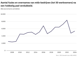 Het totaal aantal fusies en overnames in het midden- en kleinbedrijf (mkb) is tussen 2007 en 2024 verdubbeld. Dit wordt weergeven in onderstaande grafiek, waarbij tot het mkb de bedrijven met maximaal vijftig werknemers worden gerekend.
