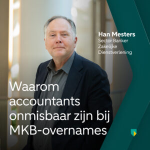 Een overname is een zeldzame en unieke gebeurtenis en het moment waar veel ondernemers naar uitkijken, en tegelijkertijd nachten van wakker liggen. En in de coulissen van deze complexe transactie, vooral bij financieringen tot zo’n 1 miljoen euro, speelt de regionale accountant een onschatbare rol. Niet in de hoofdrol, maar als de persoonlijke en betrouwbare adviseur en regisseur van zijn klant die de verbinding legt tussen koper en bank.
