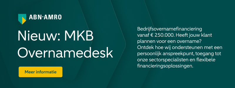 ABN AMRO is zich bewust van haar maatschappelijke verantwoordelijkheid als financier van het mkb. Door een propositie te introduceren die specifiek is gericht op het financieren van overnames in het mkb tot 1 miljoen euro, krijgt de accountant van de overnemende partij een instrument in handen om in samenwerking met de bank een overname van zijn klant mogelijk te maken.